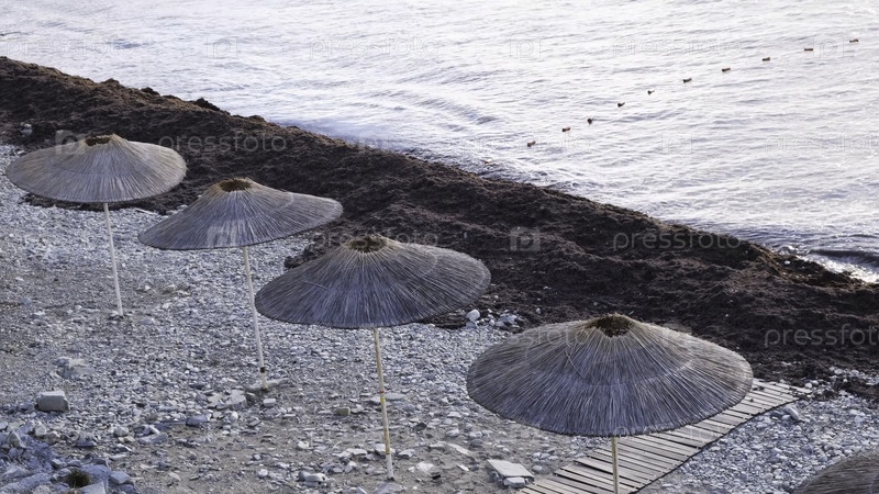 Летний пейзаж с галечным пляжем и зонтиками для защиты от солнца