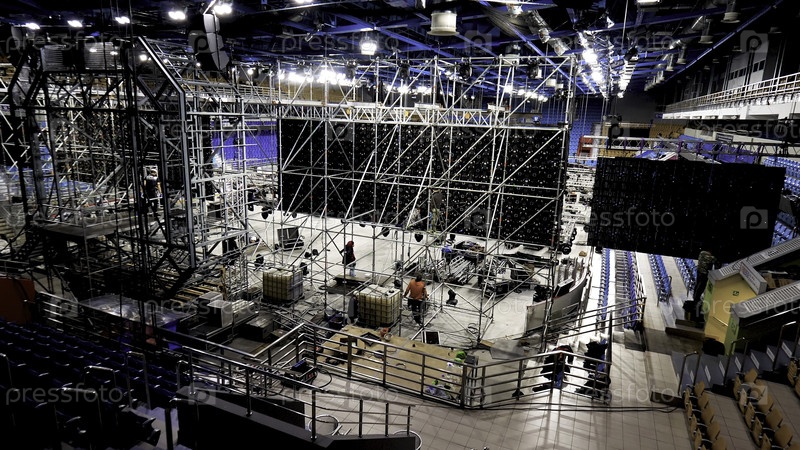 Установка оборудования и прожекторов для сцены. резервные кадры. Подготовка сцены с помощью трибун, профессионального оборудования и прожекторов перед выступлением или соревнованием