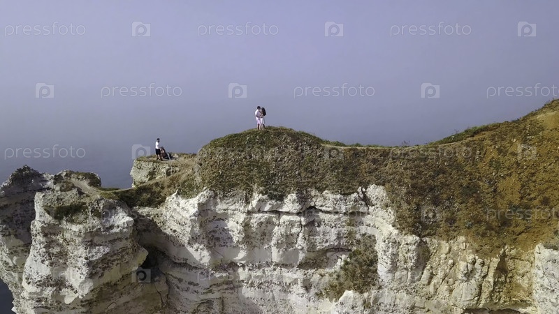 Молодая пара идет по узкой тропе в жаркое лето на фоне серого горизонта