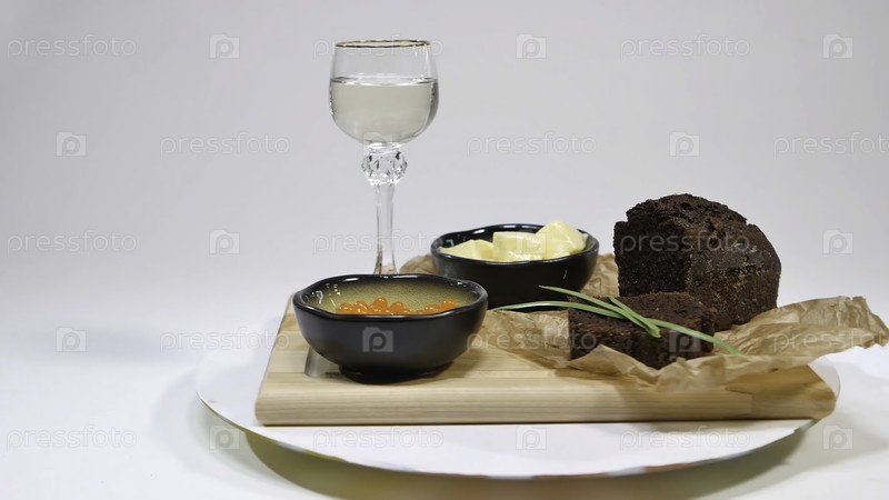 Свежая красная икра с базиликом и маслом на хлебе в студии. Она разводится из красной икры со стаканами вина на заднем плане. Холодная русская водка с льдом и небольшие бутерброды-перекусы с маслом и рыжей лососевой икрой на старом деревянном столе в руст