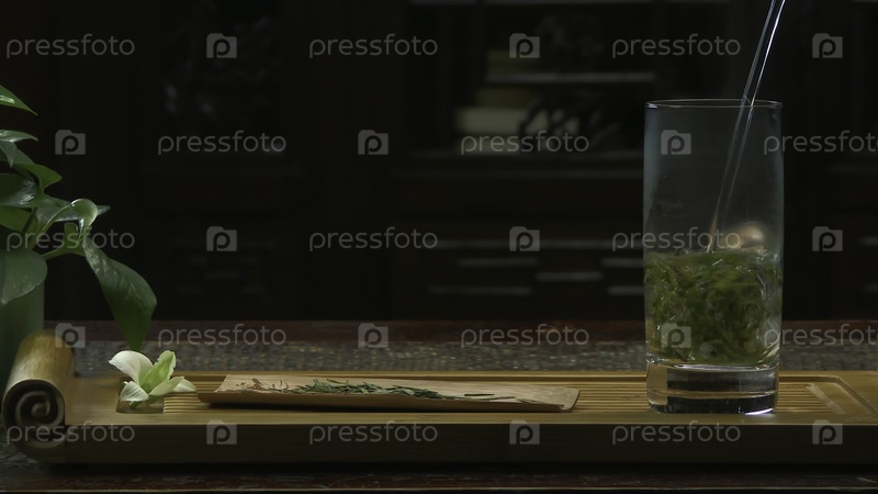 Чайная церемония.Женщина наливает горячую воду в чайник.Стеклянный чайник с цветущим чаецветком внутри