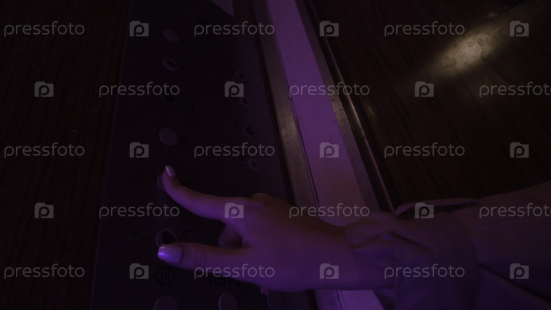 Вид женской руки, нажимающей все кнопки внутри старого лифта