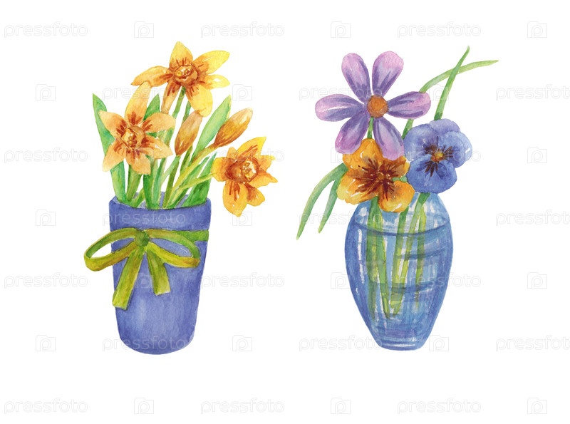 Набор букетов в вазах. нарциссисты и космики. иллюстрация, написанная от руки акварелью