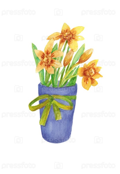 Нарциссисты в вазе Букет цветов, изолированный на белом фоне Иллюстрация написана от руки акварелью