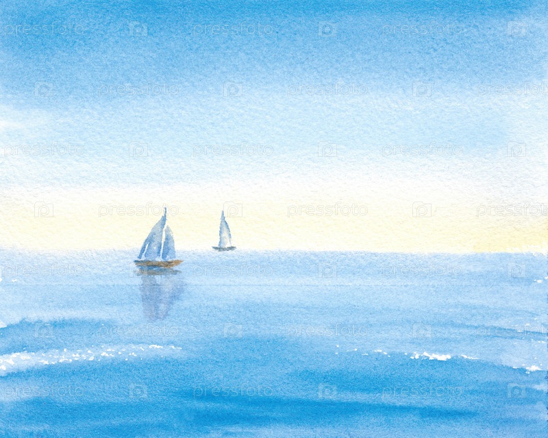 Летний пейзаж, море и парусные лодки. картина написана вручную акварелью