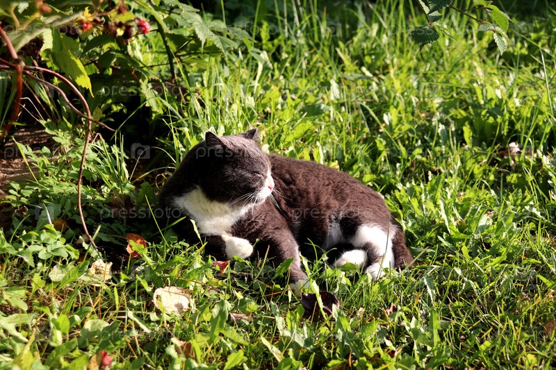 Серый кот лежит на траве, заглядывая от яркого солнца, в саду в солнечный осенний день