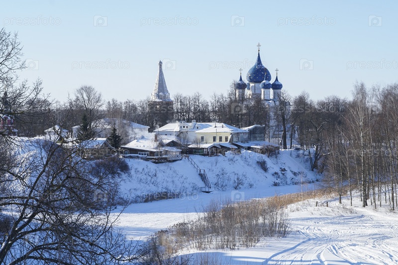 Зимний пейзаж города Суздаль. Вид на реку Каменку с паводковыми лугами, остатками валов и Рождественский собор Кремля в Суздале на заднем плане