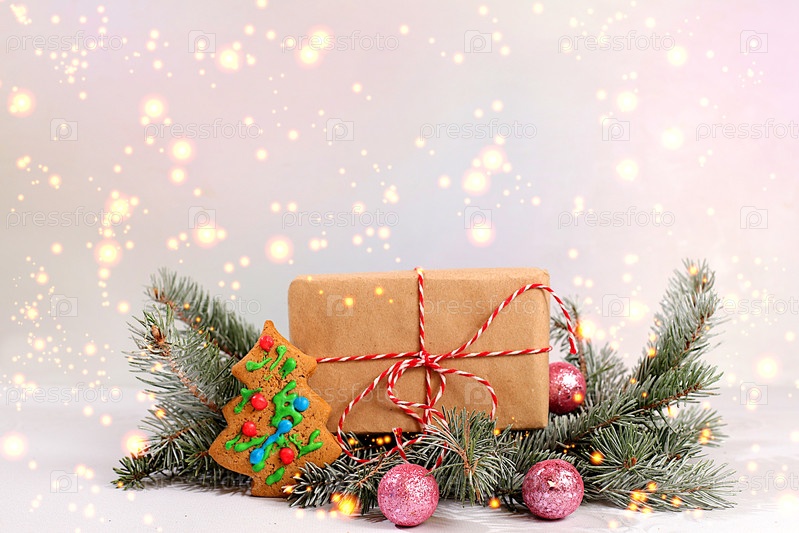 Праздничная коробка с подарками, пряники и рождественские украшения на ветвях соснового снега, концепция канун Рождества, рекламный баннер магазина для новогодних распродаж, Счастливый Новый год