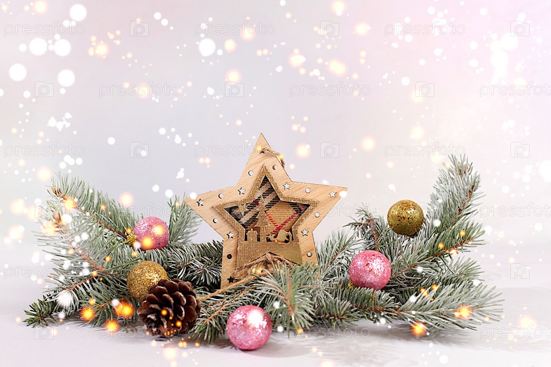Праздничная зимняя поздравительная открытка и баннер на экране, красивый рождественский и новогодний фон с огнями, ювелирными изделиями, игрушками и живыми ветвями пихты, дизайн продукта для праздничной рекламы,