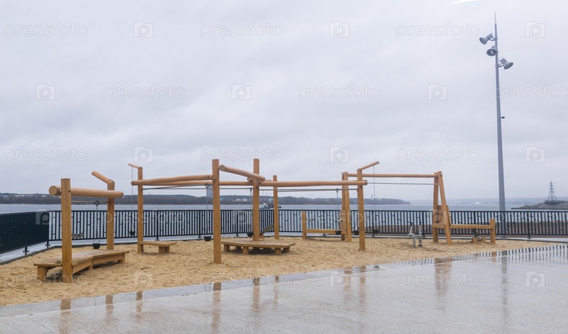 Деревянная детская площадка на пляже в пасмурную погоду. зимнее время года