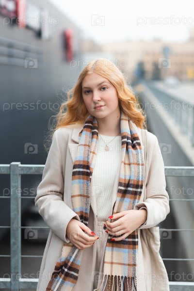 Молодая, стильная женщина с длинными красными волосами в бежевом пальто