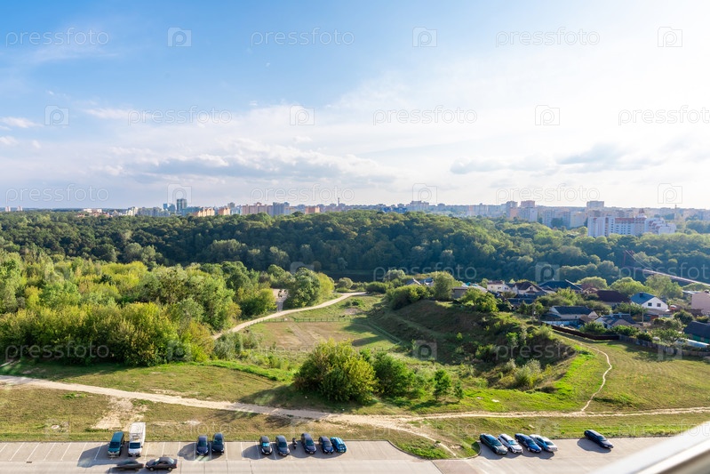 Проветрительный городской пейзаж с зеленым лесом, домами, припаркованными автомобилями и отдаленными жилыми зданиями под чистым голубым небом