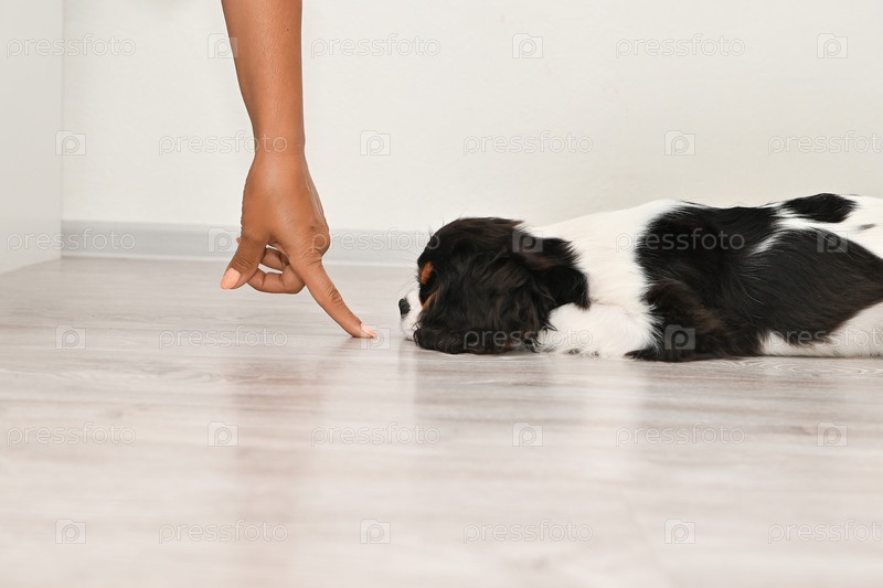 Щенок кавалера короля Чарльза-спаниеля лежит на полу, печально глядя на свой указательный палец.Наказание и обучение маленького щенка