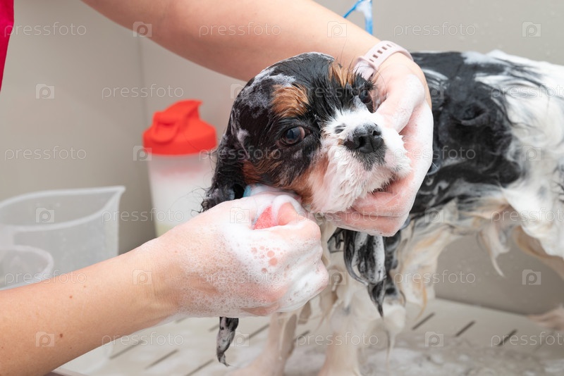 Смешный портрет короля Чарльза Шпаниель, принимающий душ с шампунем.Собака принимает пузырьковую ванну в салоне по уходу за животными