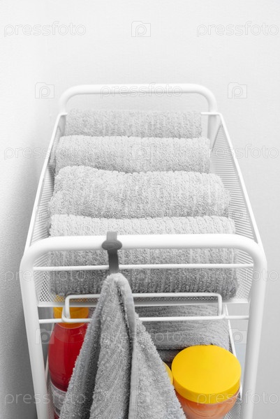 Белая полка содержит аккуратно сложенные седые полотенца. Ниже - бутылки с красочным шампунем. Настройка включает в себя салон или зону для ухода за домашними животными