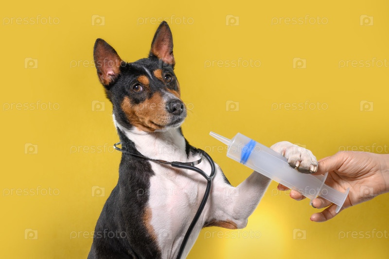 Ветеринар тщательно вводит жидкое лекарство на желтом фоне собаке Басенджи.Лечение животных в клинике