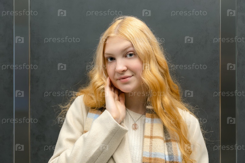 Красивая молодая женщина с длинными светлыми волосами и вдумчивым, нежным выражением лица позирует внутри дома в современной обстановке, одетая в бежевое пальто и чеканный шарф