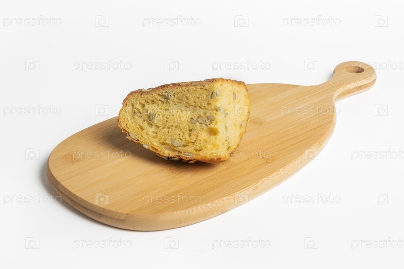 Кусок свежего тыквенного хлеба на деревянной доске и белом фоне