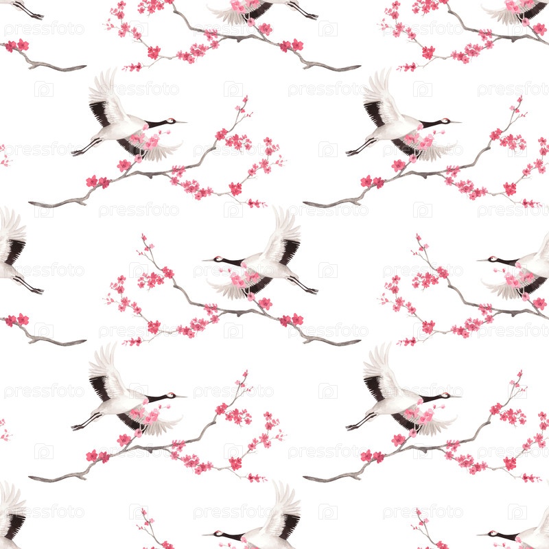 Бесшовный рисунок вишневых ветвей и японских красных коронных журавлей. Иллюстрация ручной акварели. Для ткани, обоев, поздравительных открыток, дизайна, декора и иллюстрации
