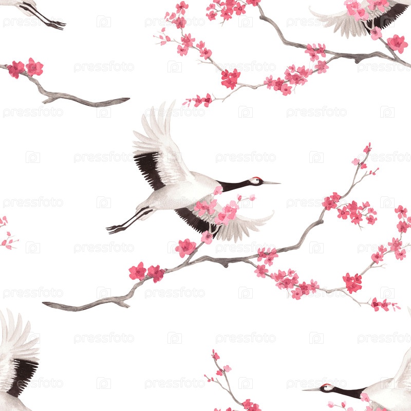 Бесшовный рисунок цветов вишневых и японских красных кронных журавлей. Иллюстрация акварели ручной работы. Для ткани, обоев, поздравительных открыток, дизайна, декора и иллюстрации
