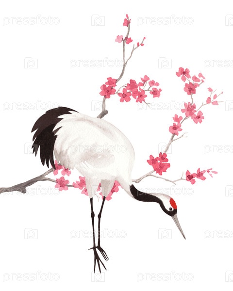 Стоящий японский красный коронный кран с вишней в фоне. Иллюстрация ручной акварели. Для ткани, обоев, поздравительных открыток, дизайна, декора и иллюстрации