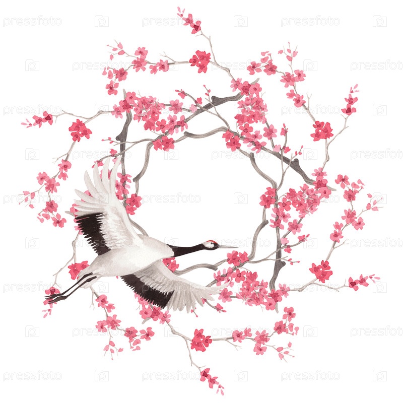 Венок из вишневых ветвей и галактический красный коронный кран. Иллюстрация ручной акварели. Для ткани, обоев, поздравительных открыток, дизайна, декора и иллюстрации
