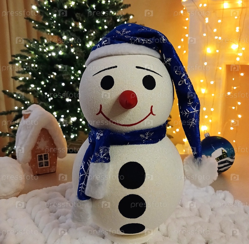 Красивый снеговик в синей шляпе и с хорошей улыбкой на фоне гирлянды. игрушка для подарка или украшения комнаты к Новому году или Рождеству. теплота и доброта