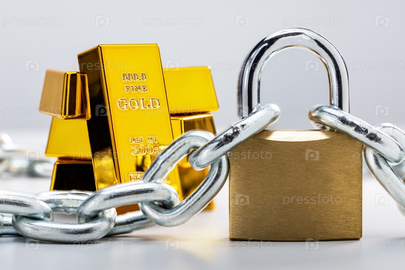 Золотые слитки и цепной замок на сером фоне, крупный план. концепция конфискована, юридические вопросы, безопасные хранилища
