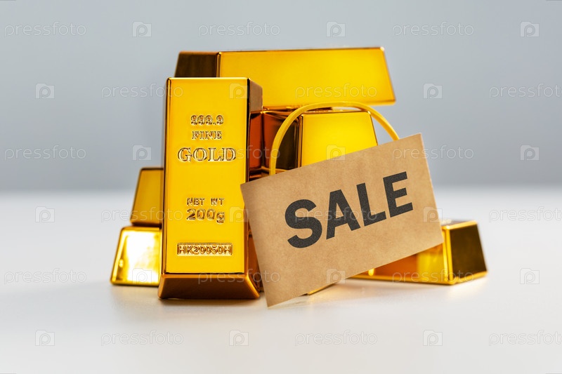 Золотые слитки с надписью 'продажа' на сером фоне. символ богатства и инвестиций