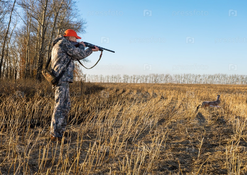 Человеческий охотник нацелен на трофей кролика или зайца в осеннем поле