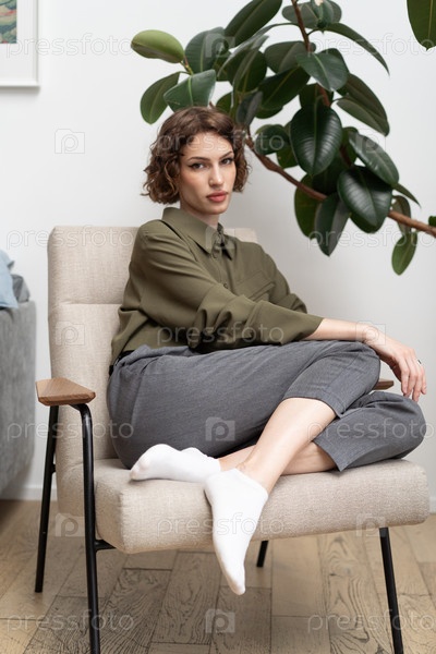 Красивая молодая женщина позирует в зеленой рубашке в студии, сидящая