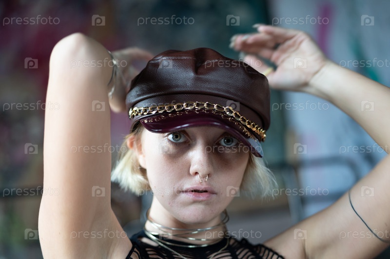 Портрет красивой молодой женщины в кожаной шляпе в студии