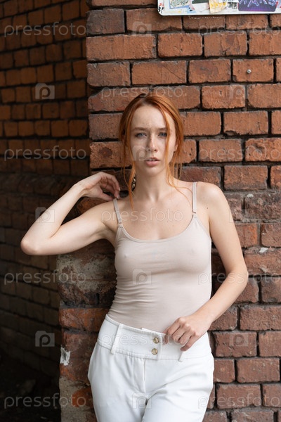 Красивая молодая женщина позирует в белых джинсах