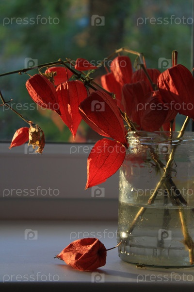 Физалис на окне в лучах заходящего солнца