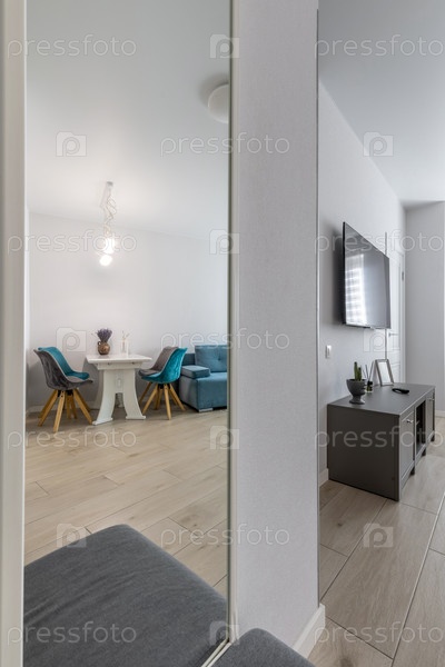 Яркая современная гостиная с голубым диваном, обеденным столом, стильными стульями и телевизором, отражающимся в зеркале на стене, создавая уютную и просторную минималистическую атмосферу