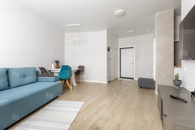 Яркий современный интерьер гостиной с голубым диваном, столовой и минималистическим скандинавским дизайном, создавая уютную и элегантную домашнюю атмосферу