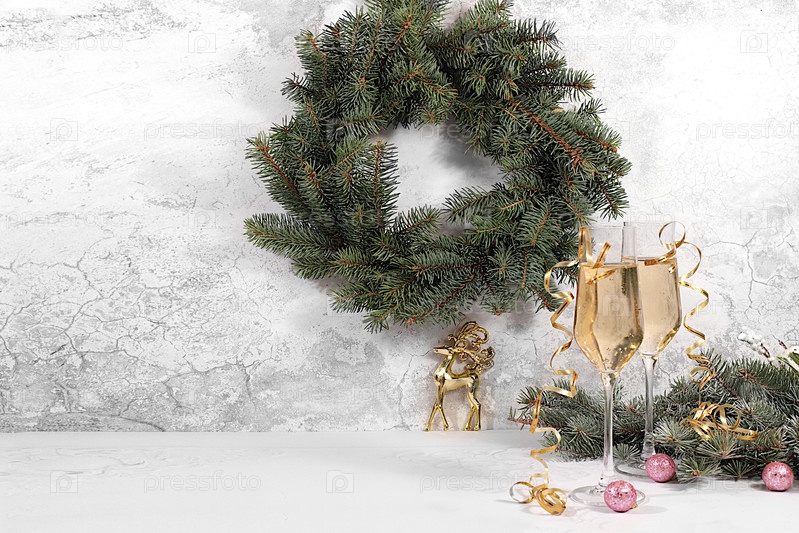 С Новым годом.Два бокала шампанского на праздничном фоне смоковниц и украшений, концепция канун Рождества.Рождественская и новогодняя компоновка для дизайна и продаж