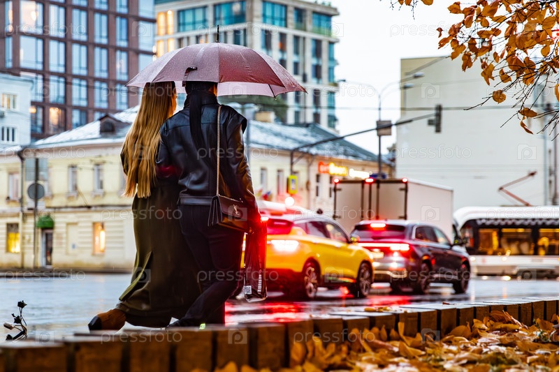 Пара под зонтиком на улице города осенью
