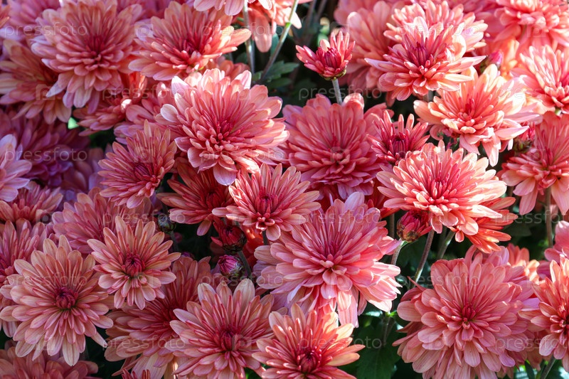 Осеннее цветение розовых хризантемов на клумбе, первоначально освещенном солнцем - некоторые зажжены, другие в тени