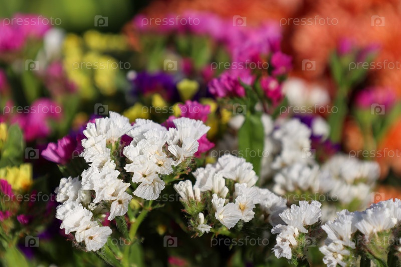 Белые сушеные цветы (статические) на размытом многоцветном фоне