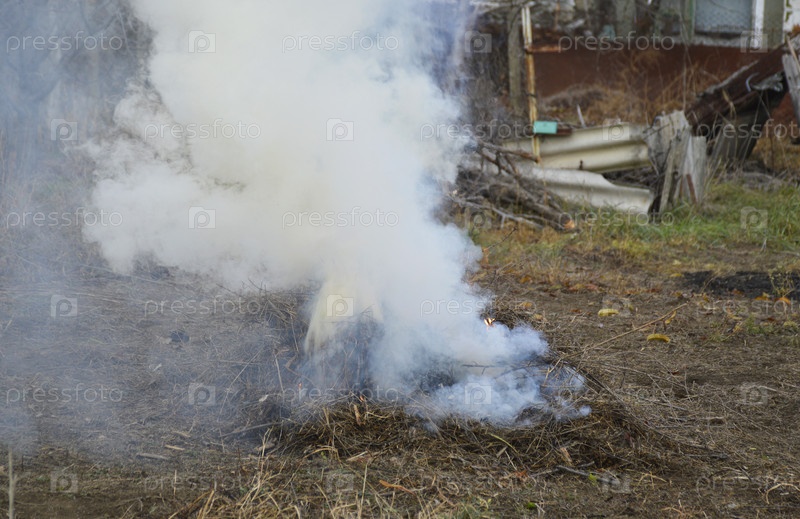 Сухая трава горит ярким пламенем и сильным белым дымом. Опасность пожаров во время засухи и отсутствия дождя, деградация окружающей среды, глобальное потепление. Выбросы в воздух