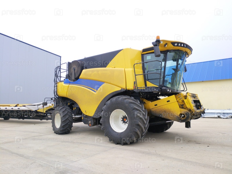 Желтый комбайн припаркован перед тем, как войти в поле для сбора урожая