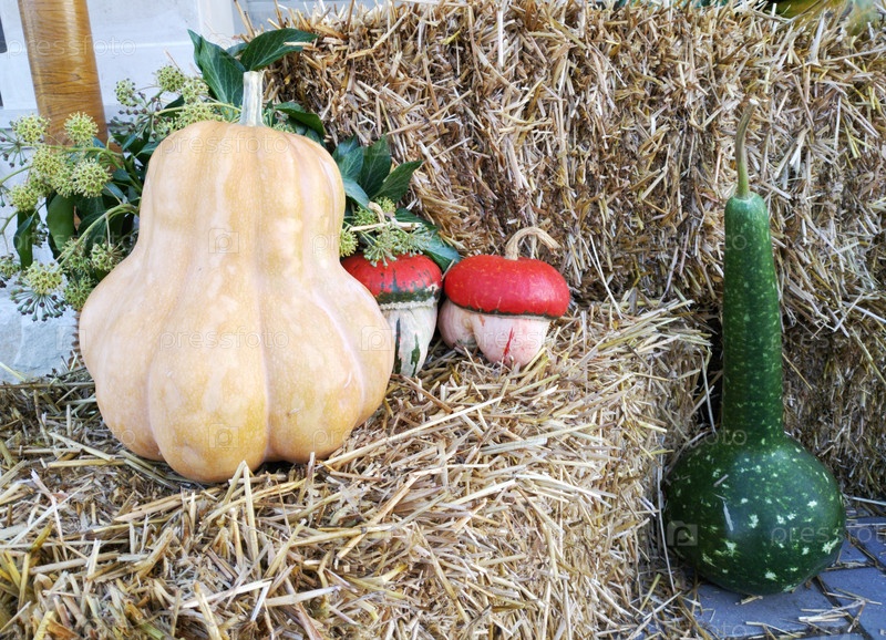 Декоративные тыквы расположены на сенарах. В центре большая, необычной формы тыква. Рядом есть красная и белая турецкая тыква, а справа - бутылочная тыква. Ярмарка урожая