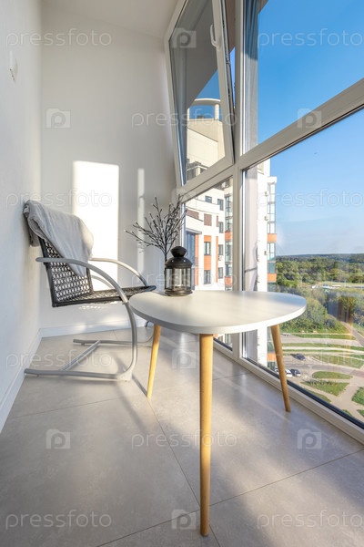 Яркий современный балкон со стулом и маленьким столом возле больших панорамных окон с видом на зеленый пейзаж