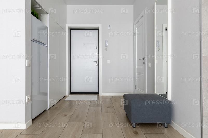 Яркий современный интерьер входа с серым османским цветом и зеркалом