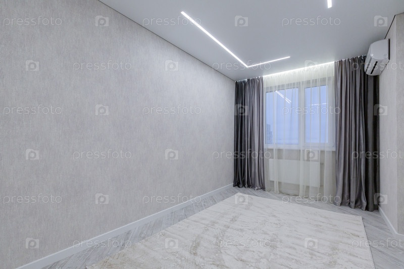 Пустая комната с серыми стенами, большим окном и минималистическим линейным освещением