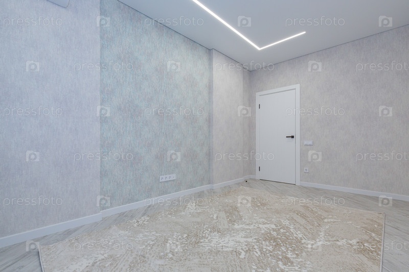 Минималистская пустая комната с легким ковром, текстурированными стенами и линейным освещением