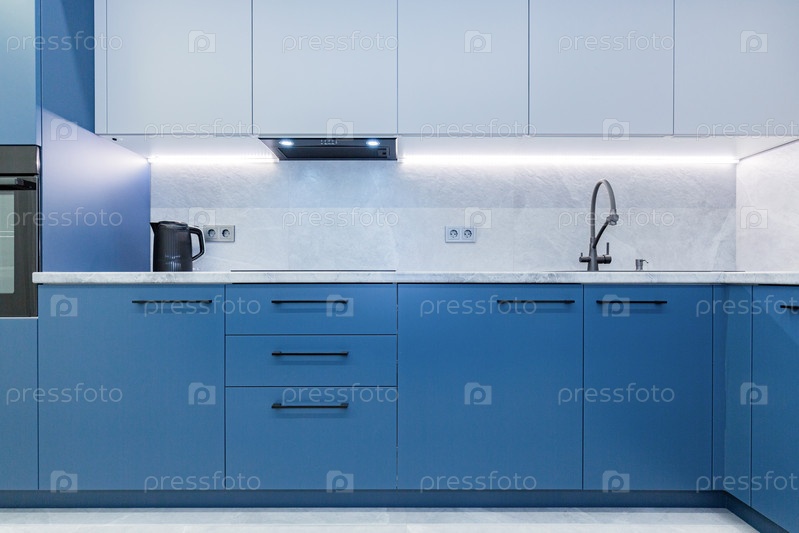 Фрагмент голубой кухни с черным раковиной, миксером и чайником