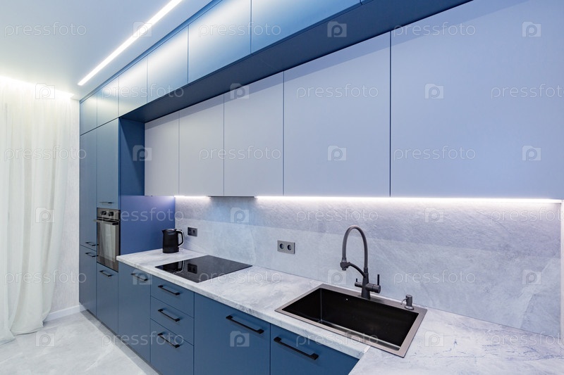 Фрагмент современной голубой кухни с интегрированным черным раковиной и индукционной плитой