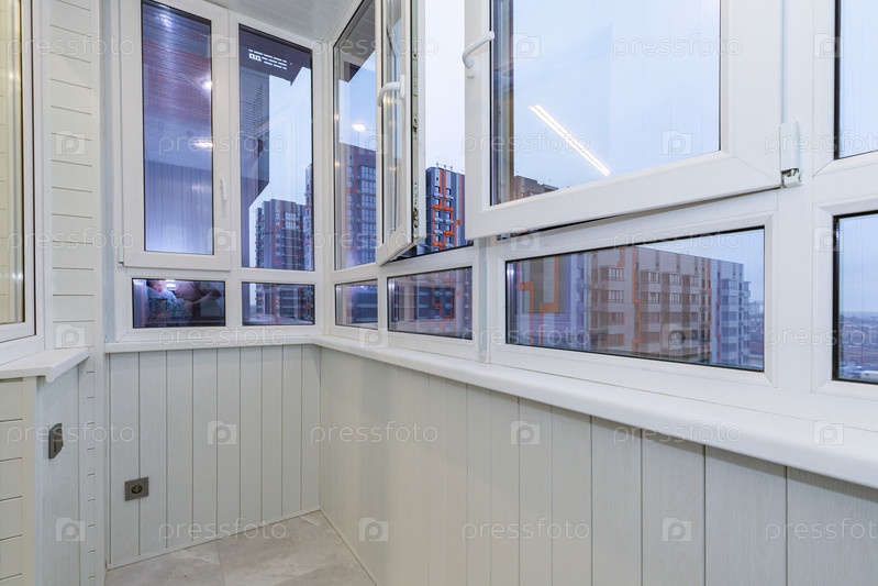 Угловой угол балкона (логиджи) с панорамным остеклением и видом на многоэтажные дома